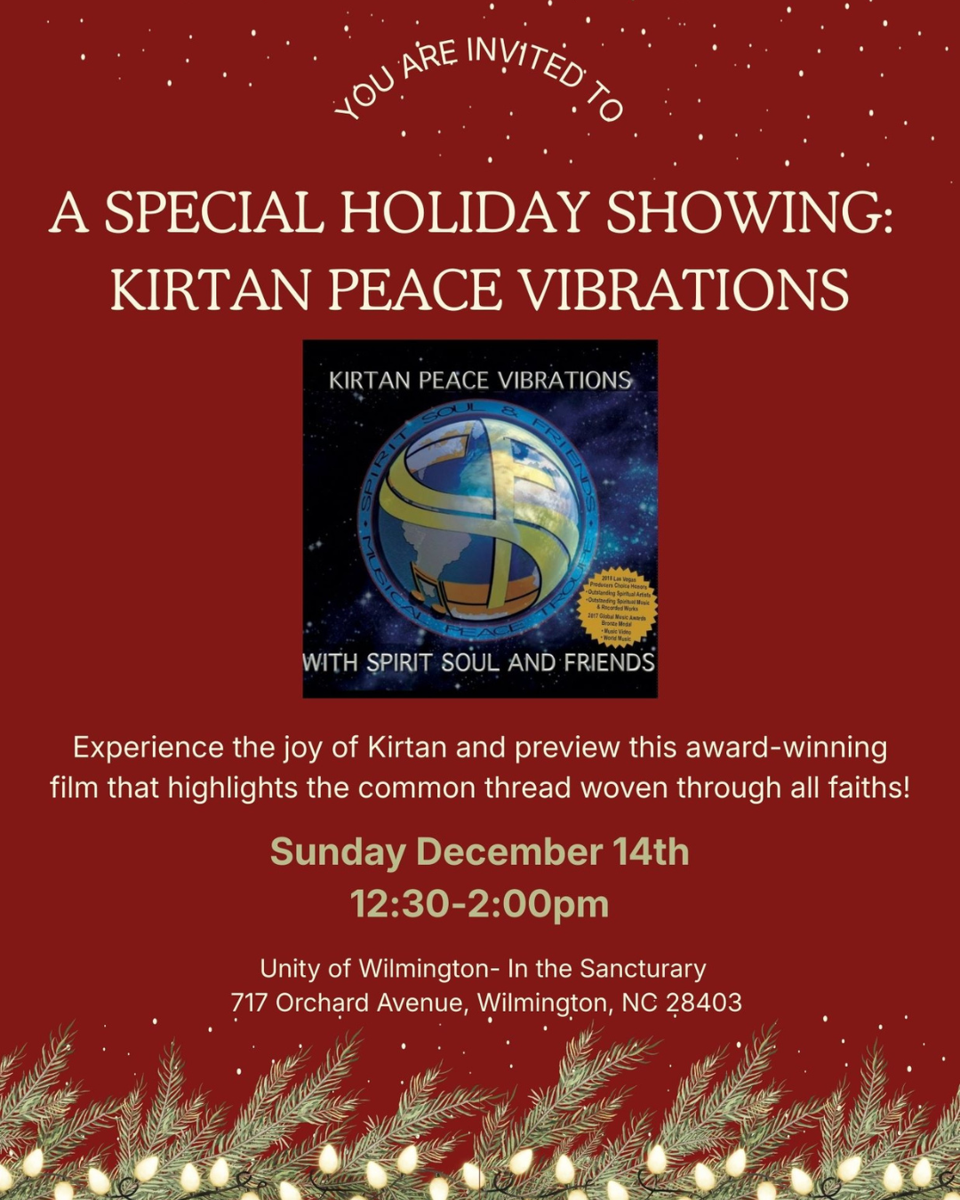 What's happening: We will have a short Kirtan talk followed by a screening of Kirtan Peace Vibrations — a video focused on showcasing the universal principle of chanting God’s names. This film weaves together quotes from religions around the world along with beautiful chanting. Come sing, connect, and be inspired.