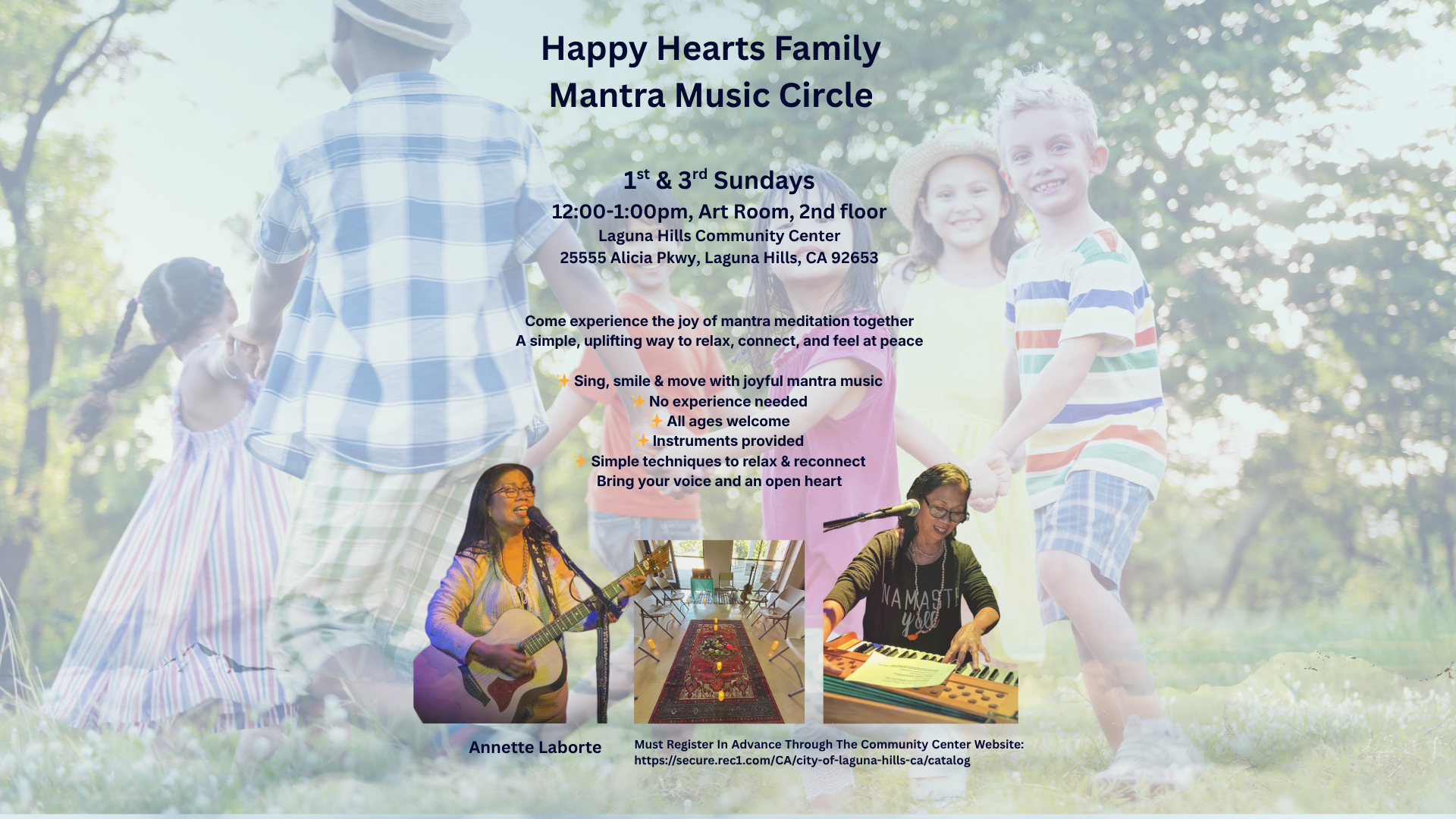 Join us for a joyful Family Mantra Music Circle where kids, parents, grandparents, and friends can come together to sing, clap, move, and chant simple uplifting mantras.