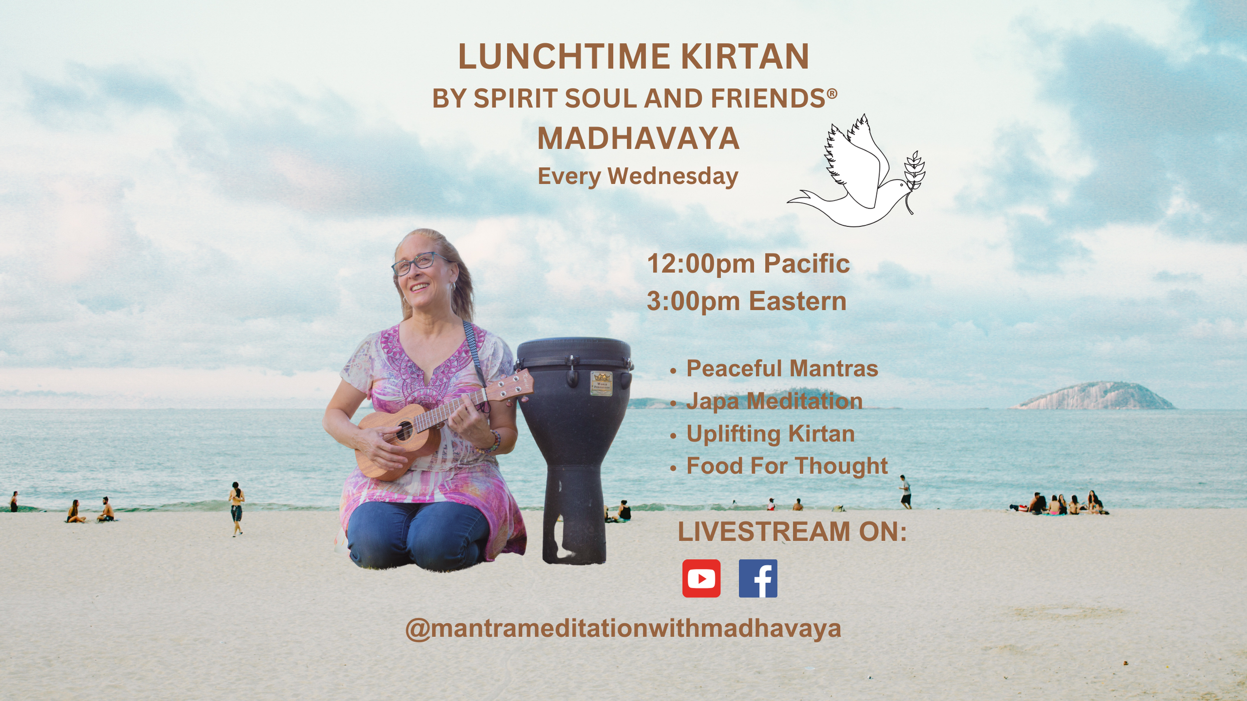 Take a break during your lunch hour at work or at home and join Madhavaya for "LunchTime Kirtan" filled with  soulful kirtan, chanting, and meditation as we gather to nourish the spirit soul with the beautiful spiritual sound vibrations and devotional music.