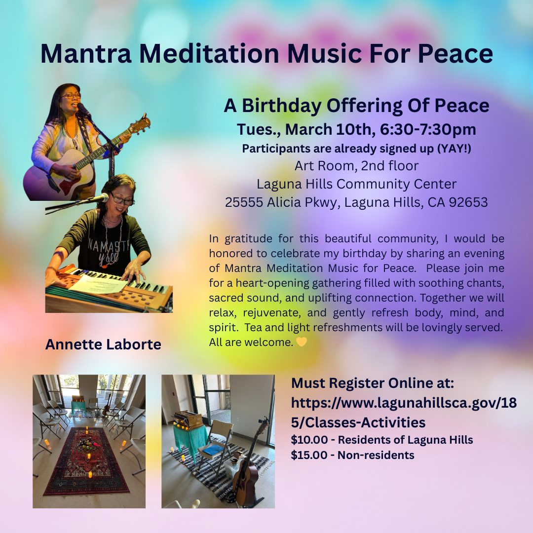As a gift to the community on my birthday, I would love to celebrate by sharing with you the gift of peace. Please join me for a heartwarming gathering of Mantra Meditation Music for Peace. We’ll be surrounded by the gentle, ambient sounds of harmonium and guitar, flowing into guided japa meditation with mala beads and soft breathing practices supported by the calming resonance of peaceful mantras. The evening will blossom into joyful mantra music with light, heart-opening movement—an invitation to simply be, breathe, and uplift one another. Come unwind, renew, and nourish your body, mind, and spirit in a beautiful, supportive space. We’ll conclude with tea and light refreshments, allowing time to connect and share together. It would be a blessing to celebrate in your presence.